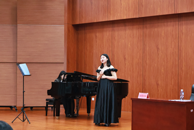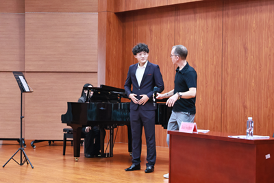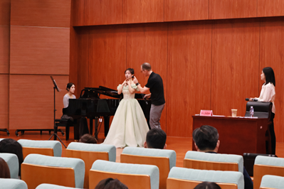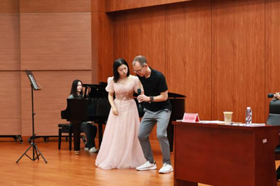 在教学方法研讨过程中,我院本科、研究生学生田佳丽、贾浩、马思南、殷雨欣四位学生先后登台,分别演唱了声乐《亲切的名字》《负心人》《你发火,就爱生气》《尤卡利》,萨瑟恩教授针对每位学生的演唱进行了单独的指导,学生们在现场呈现出明显的变化,引得现场爆发阵阵掌声。萨瑟恩教授就如何更好地运用气息并通过气息控制增强音色层次与戏剧表现力进行了讲解示范,令在场师生深受启发。