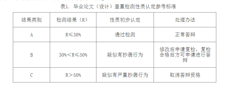 (3)毕业论文(设计)查重检测性质认定参考标准。查重检测结果达标是论文具有答辩资格的必要条件。未达标的论文必须修改或重做,修改后的论文须经指导教师严格把关,查重检测结果达到要求后方能参与答辩。申请校级优秀论文,检测结果(R)文字复制比不超过20%。