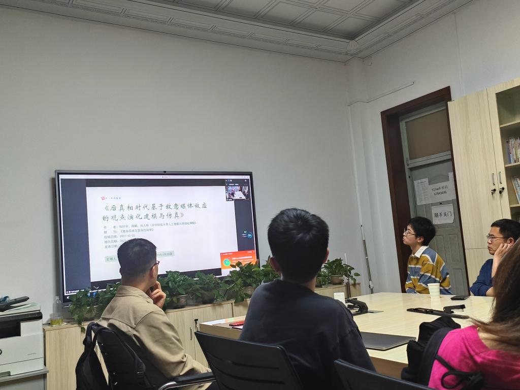 接着,马梦如同学进行论文分享。马梦如同学带领大家精读论文《后真相时代基于敌意媒体效应的观点演化建模与仿真》,主要是观念动力学模型的复现。于同洋老师提出可以考虑算法素养是否能与该方法结合,各位老师建议消化领会该方法后要结合现有的研究领域。毕达宇老师、李超锋老师和于同洋老师针对观点动力学建模在管工领域的应用和发文情况进行了讨论。毕达宇老师强调,各位同学选择研究方向时要有考量,要有目标领域的期刊。