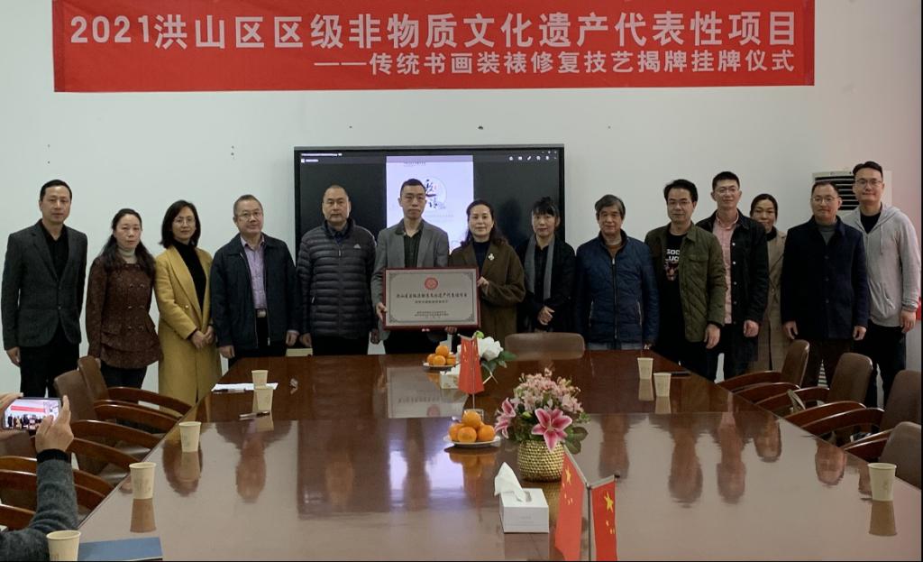 3月16日上午,“2021洪山区区级非物质文化遗产代表项目——传统书画装裱修复技艺”揭牌仪式在民族美术实验教学师范中心举行。传统书画艺术装裱修复技艺代表李广来,洪山区文化和旅游局副局长彭汉琍,湖北中国画研究院院长孔奇,湖北中国画研究院副院长、湖北省工艺美术研究所国画创研室主任李孟,长江职业学银艺术学院院长苏龙,武汉大学中国传统文化研究中心研究员刘乐恒,beat365官网民族学博物馆常务副馆长刘卫国、继续教育学院副院长刘凝芳,以及我美术学院院长吴海广、副院长程超、副院长彭阳陵及教师代表等参加揭牌仪式。仪式由副院长程超教授主持。