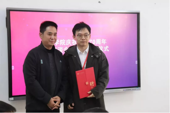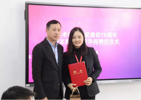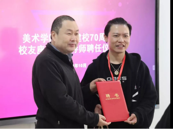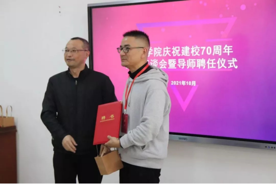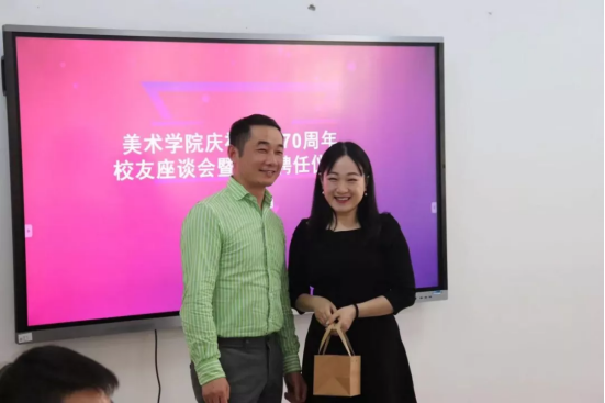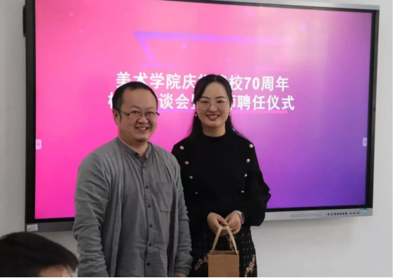 此次座谈会邀请到的校友嘉宾有00级艺术设计专业熊耀辉(独立设计师),00级艺术设计专业程文婷(湖北工业大学工业设计学院副教授),01级艺术设计专业王世勇(武汉两点十分文化传播有限公司CEO),03级装潢艺术设计专业邹蕾(华扬联众数字技术厦门有限公司),06级环境设计专业耿威(深圳迈丘景观规划设计有限公司合伙人、高级工程师),08级环境设计专业易炫睿(中南建筑设计院股份有限公司设计师),12级动画专业/16级设计艺术学硕士研究生王艳(安徽建筑大学科研办主任)。此次座谈会由学院党委副书记张雯君主持。座谈会上,吴海广院长首先代表学院致欢迎辞,看到校友回家感到非常亲切,对校友嘉宾们在这样一个特殊的日子,荣归母校共庆建校70周年,表示热烈的欢迎和诚挚的谢意。随后,他从教学环境、专业设置、人才培养、创新创业、升学就业等方面全方位向大家介绍了美术学院近十多年来的建设与发展。接着,与会教师代表与校友嘉宾进行了亲切的交流,大家共同回忆往昔,各位校友嘉宾纷纷畅谈自己的近况,以及工作方面的规划发展,表示在母校四年的专业学习为如今的专业建树和个人发展打下了坚实的基础。此次座谈,加深了学院与校友之间、与会师友之间的了解,为彼此答疑解惑,共同约定合作发展的美好愿景,会议气氛轻松愉快。随后,美术学院领导班子为校友嘉宾赠送颁发了专业导师聘书并颁发了校友纪念品。