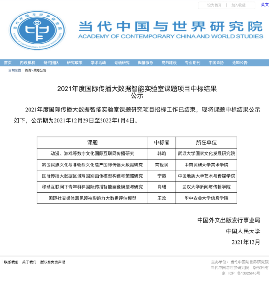 我院商世民教授的《我国民族文化与非物质文化遗产国际传播大数据研究》荣获2021年度国际传播大数据智能实验室课题项目。