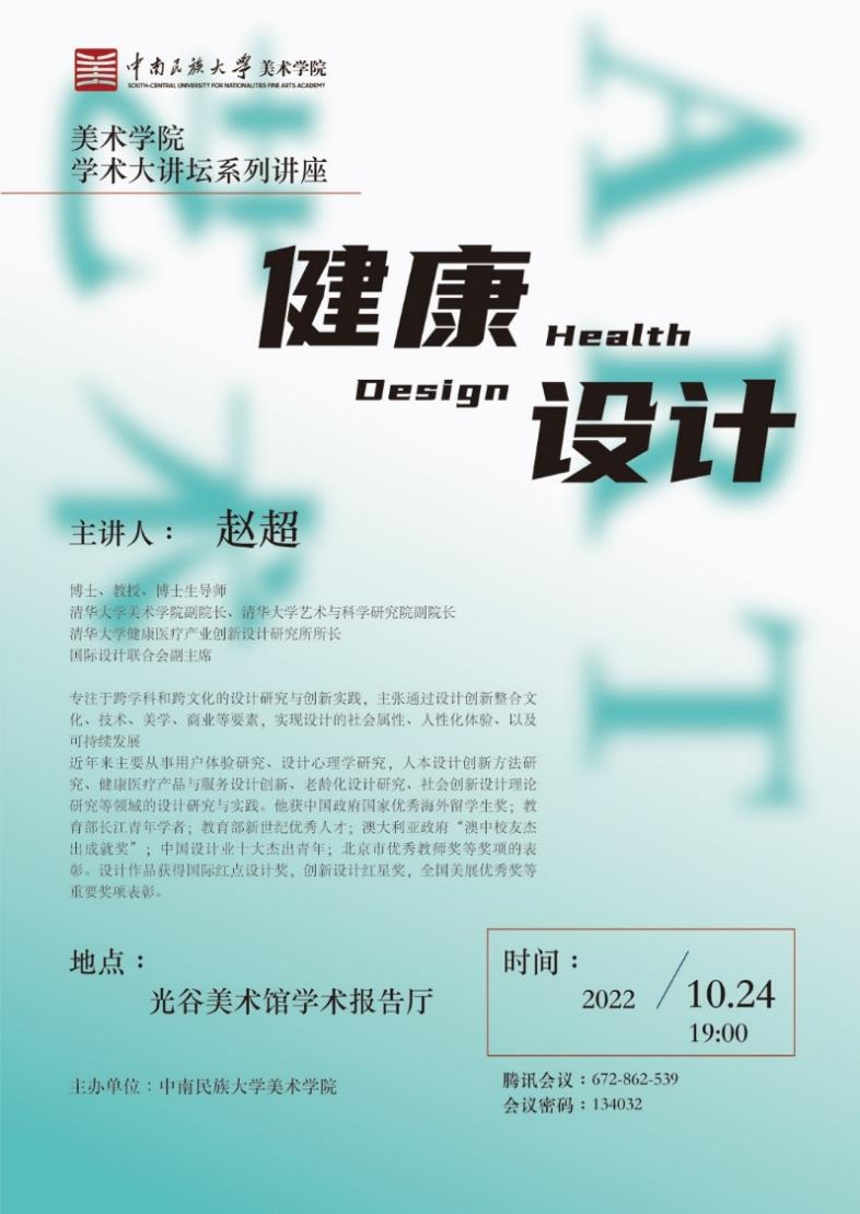 主讲人赵超博士为清华大学美术学院教授、副院长,清华大学艺术与科学研究院副院长,清华大学健康医疗产业创新设计研究所所长,国际设计联合会副主席。赵超博士专注于跨学科和跨文化的设计研究与创新实践,主张通过设计创新整合文化、技术、美学、商业等要素,实现设计的社会属性、人性化体验、以及可持续发展。