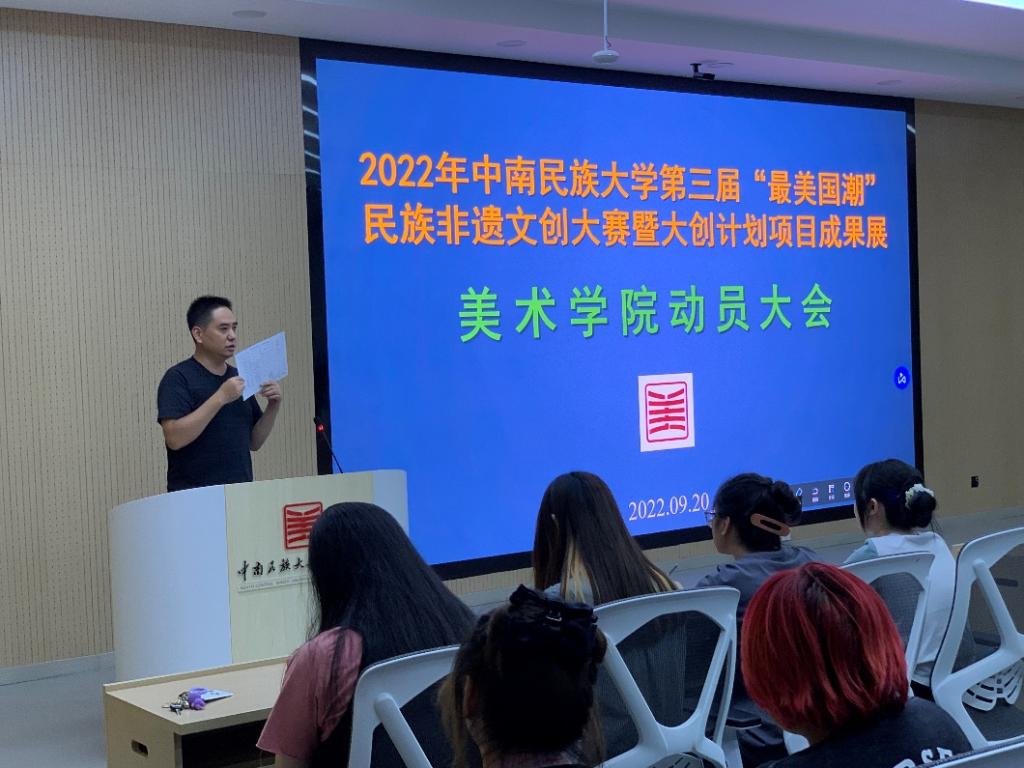 9月20日下午13时,美术学院举行2022年第三届“最美国潮”民族非遗文创大赛暨大创项目成果展动员大会。活动由美术学院团委副书记王海涛主持,美术学院副院长潘俊,硕士研究生、本科学生干部、学生代表及美术学院2022年大创项目组长参加。