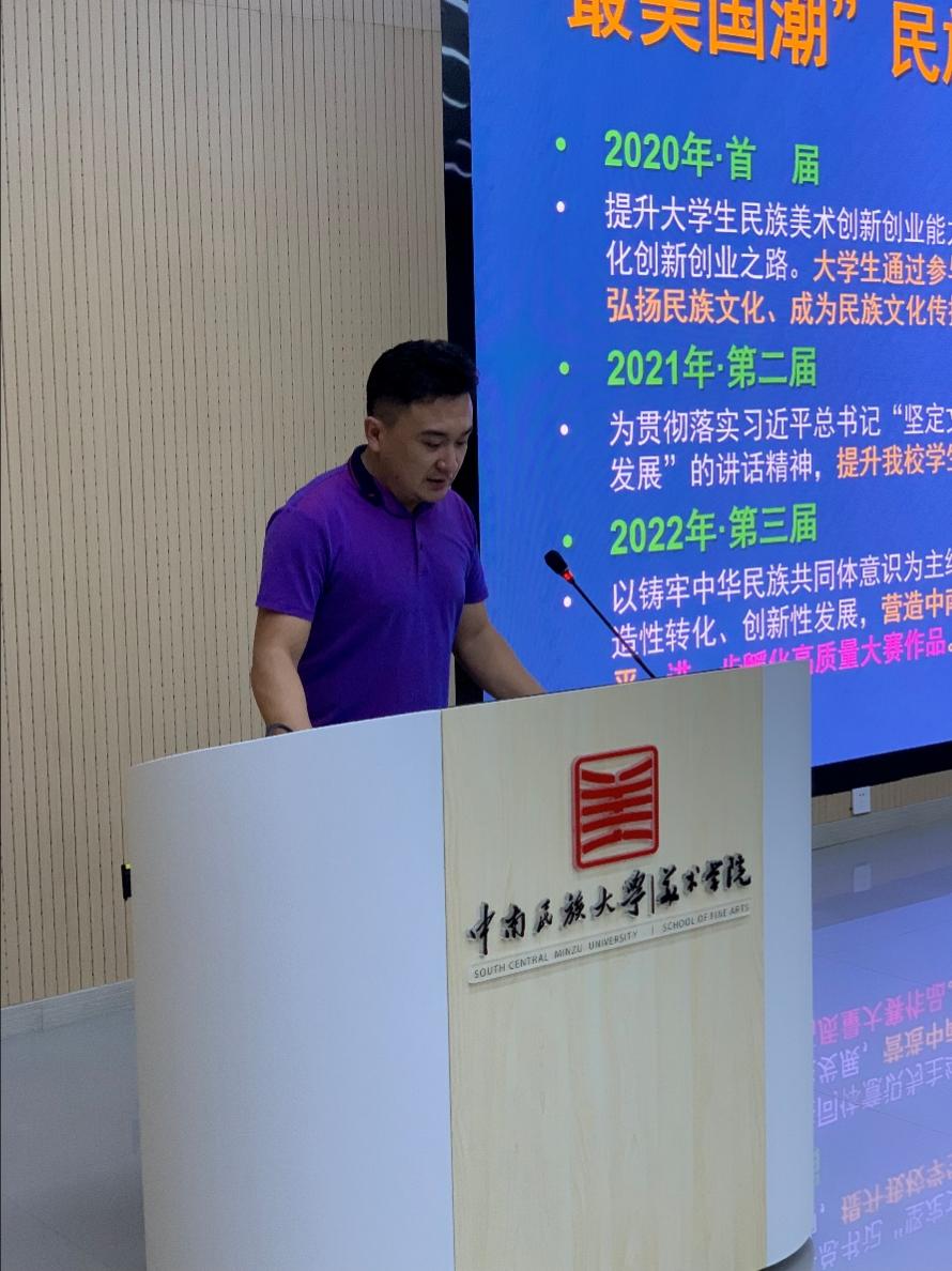 美术学院副院长潘俊老师首先发表讲话,他向同学们介绍了举办“最美国潮”大赛的意义。希望同学们在研究非物质文化遗产的过程中提升对民族文化的认知,通过参加比赛成为中华民族优秀传统文化的践行者和传播者,进而营造beat365英国正版唯一网址民族艺术的活跃氛围;在打磨作品、锻炼本领的过程中提升创新创业水平,进而孵化出高质量大赛作品。同时还强调了作品原创的重要性。