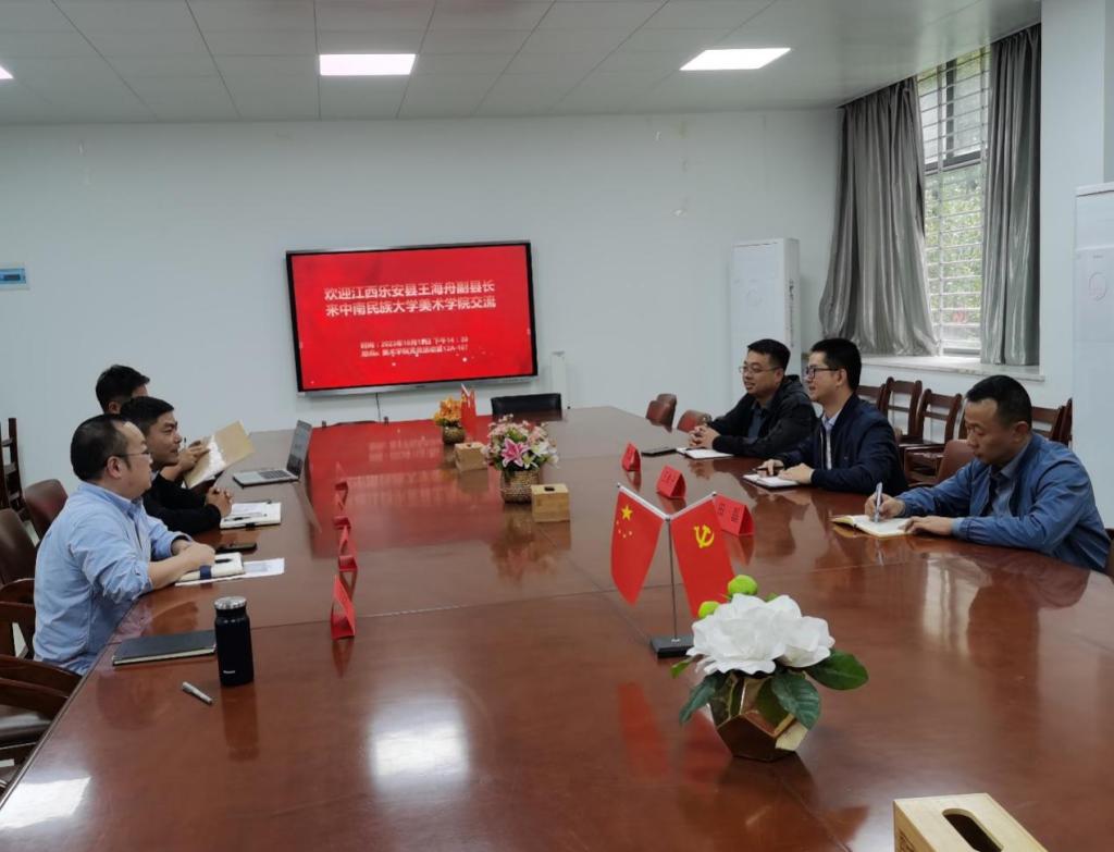 江西乐安县副县长王海舟于2023年10月12日下午莅临beat365英国正版唯一网址美术学院,就乐安写生实习基地建设事宜进行了洽谈。参与洽谈的还有beat365官网党政办副主任田磊、李云超,美术学院副院长成彪、夏晋、视觉传达教研室主任莫彦峰等人。