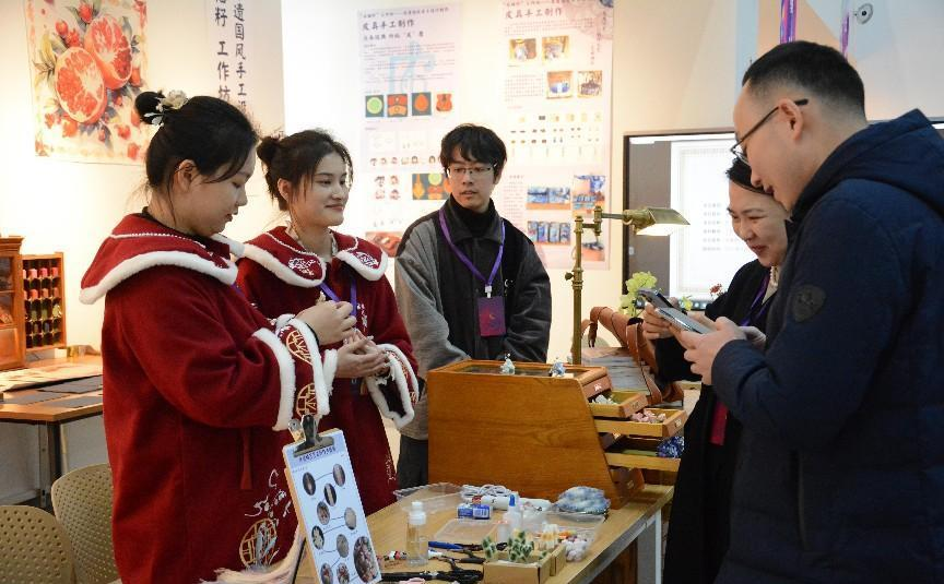 beat365英国正版唯一网址美术学院“石榴籽”非遗国风手工设计工作坊,以铸牢中华民族共同体意识为导向,以传承中华民族优秀传统文化为宗旨,将传统非遗制作技艺——绒花制作、手工皮具技艺与国风文创产品相结合,作为工作坊的主要创新内容与发展方向。