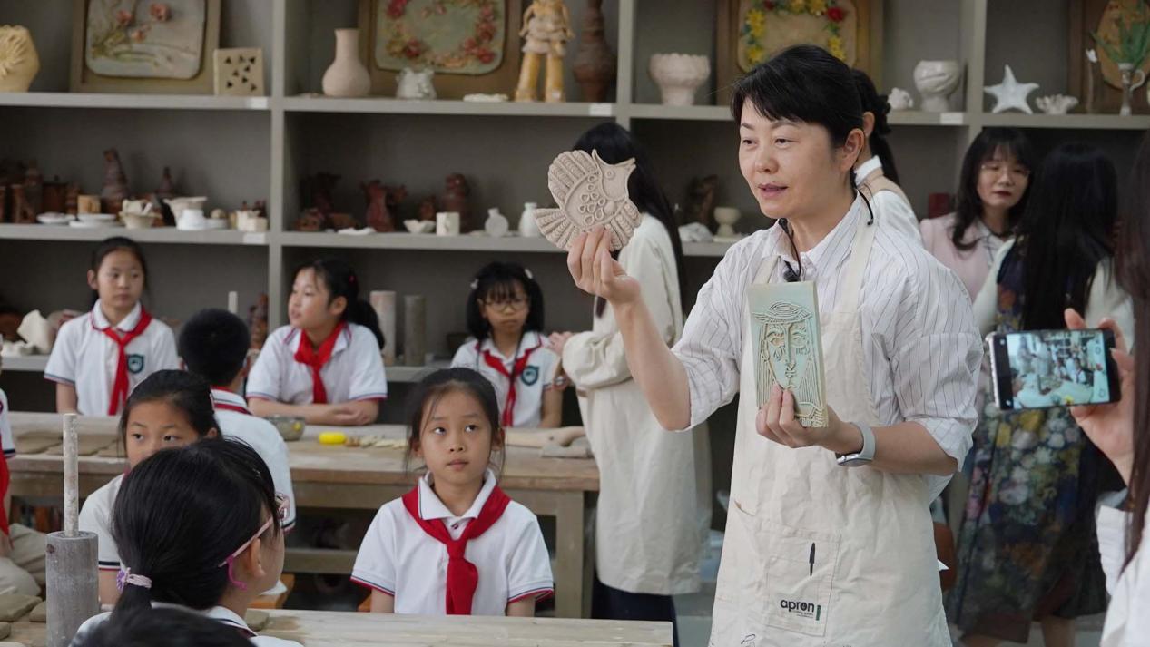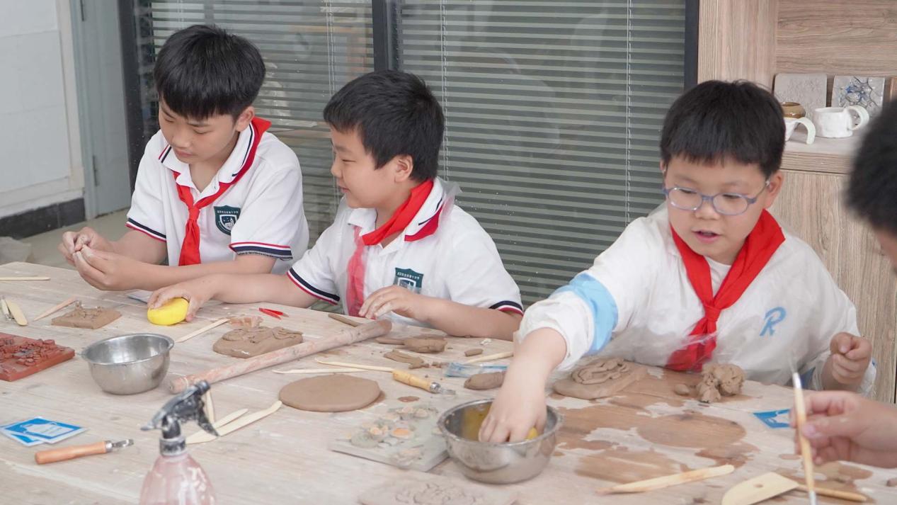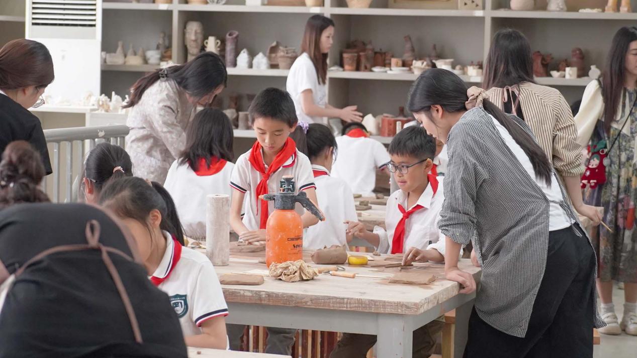 在陶艺实验室,美术学教研室主任郭红琳亲自演示揉泥、塑形、修饰等基础技法,手把手指导孩子们掌握"搓、捏、揉、刻"的要领。孩子们围坐桌前,在美院大学生的协助下,小心翼翼地将一块块陶土转化为各种创意形象,形态各异的植物花卉、憨态可掬的卡通人物纷纷诞生。实验室里充满了专注的神情与欢快的笑声,孩子们在实践中感受着陶艺的魅力。