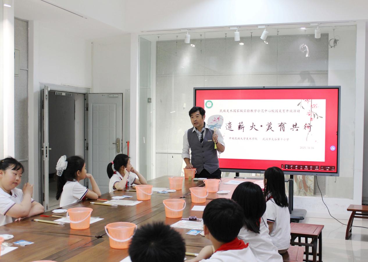 4月16日下午,美术学院举办“非遗薪火·美育共行”非遗美育进课堂活动,武汉市光谷第十小学四年级50余名小学生受邀走进民族美术国家级实验教学示范中心,在高校实验课堂上,近距离地体验了一场与传统非遗的美育对话。