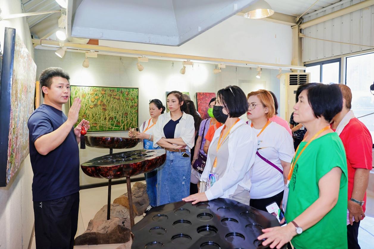 活动在示范中心传统楚漆艺实验室拉开帷幕。中心教师刘吾香老师首先介绍了传统楚漆艺的发展脉络:“漆葫芦起源于唐代,集雕刻、髹漆、彩绘于一体,是承载吉祥寓意的传统工艺。如今我们结合现代设计,让这项技艺既保留古韵又焕发新貌。”我院08届优秀毕业生湖北省工艺美术大师/武汉市国漆有限公司大漆主理人吴星,现场展示的一件件漆葫芦珍品,细腻的漆色、精美的纹饰让台湾同胞连连赞叹:“这些作品不仅是工艺品,更是文化记忆的载体。”