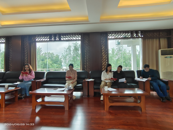本次支部主题党日活动由林毅红书记主持。活动伊始,全体党员诵读党章,重温入党誓词。活动第二项分别由党员张敏、林毅红、蓝李丹、刘婷、预备党员高婕领学。分别领学了下列文件:《深入学习贯彻习近平总书记对学校思政课建设的重要指示精神》《习近平在中共中央政治局第十四次集体学习时强调促进高质量充分就业 不断增强广大劳动者的获得感幸福感安全感》《习近平在山东考察时强调以进一步全面深化改革为动力 奋力谱写中国式现代化山东篇章》《习近平:全面深化改革开放,为中国式现代化持续注入强劲动力》《王沪宁在广西调研时强调铸牢中华民族共同体意识 切实做好新时代党的民族工作》《道中华文章:习近平论铸牢中华民族共同体意识》《专题:教育强国建设一年间·沿着总书记指引的方向砥砺前行》《中央统战部副部长,国家民族事务委员会主任、党组书记潘岳,6月12日在“中国新疆的历史与未来”国际论坛上的致辞》。以上同志领学后分别交流了心得体会。