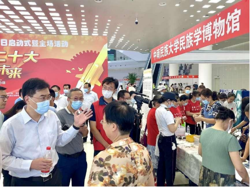 启动仪式后,湖北省政府党组成员、中国工程院院士邵新宇莅临民族学博物馆展位了解少数民族非物质文化遗产情况,志愿者为其介绍讲解,领导和嘉宾们对我馆为宣传保护少数民族非物质文化遗产作出的工作赞赏有加。