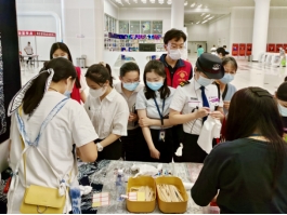 在扎染体验环节,我馆老师为参观游客展示、讲解扎染工艺品的制作流程。“先扎花,讲究松弛有度;后脱浆,避免染色不均;再浸染,深浅不同、时长相异;最后清洗拆线,就能获得属于自己独一无二的扎染手帕”。现场游客们热情高涨、积极参与,在老师及志愿者的帮助下,纷纷按照老师演示的手法进行创作,亲身体验扎染手帕的制作流程。