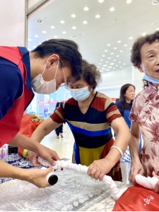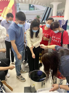 志愿者协助游客扎花 脱桨后耐心等待染色
