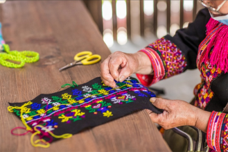 绣法上。“绣”是黎族织锦工艺的最后阶段,黎族双面绣是在织锦的正面绣图案,主要的针法有平绣、贴布绣、珠绣,用彩色丝线在面织锦的正反两面绣同样的花纹图案和颜色,是双面同形同色刺绣,正反两面针法一致,针脚均匀,疏密得当,线头和线尾均看不见,构图工整,色彩和谐,技艺十分精湛。