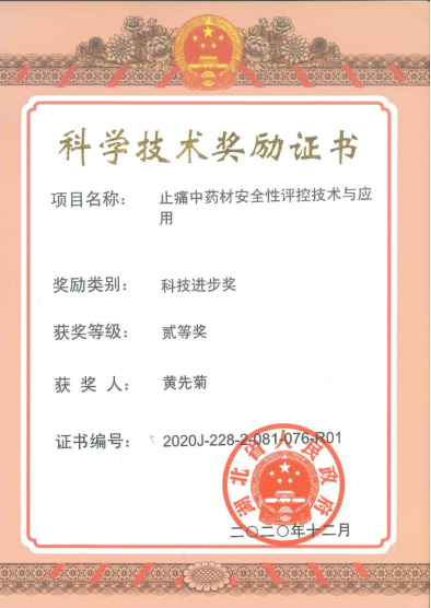 黄先菊教授长期围绕少数民族药物活性评价与开发利用开展研究,在药物有效性、安全性及质量控制方面做过多方面原创研究,2019年曾获中国民族医药协会科学技术进步奖一等奖。在“止痛中药材安全性评控技术与应用”项目中,课题组围绕止痛中药材用药安全,针对大范围、大量使用、临床中毒率及死亡率较高的特色止痛中药材,攻关雪上一枝蒿、雷公藤等代表性中药材的资源信息、品种真伪鉴定、毒效关系及不良反应控制等难题,整体提升其质量控制标准,防止止痛中药临床用药不良反应发生。
