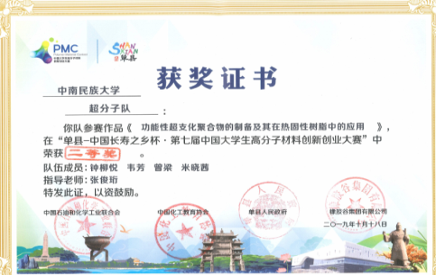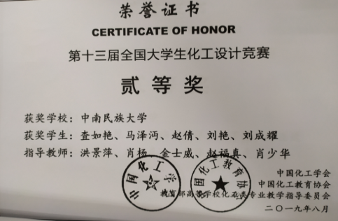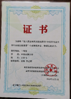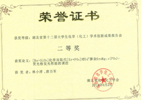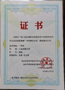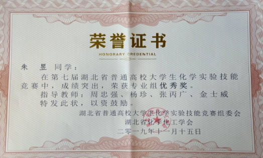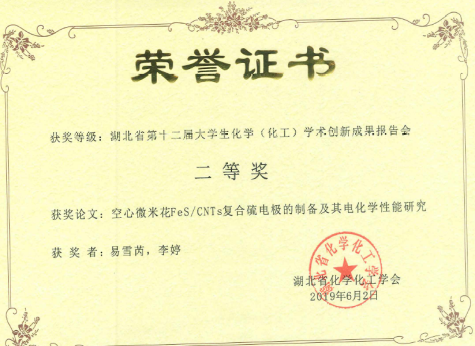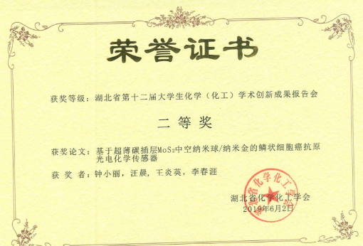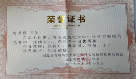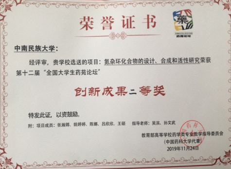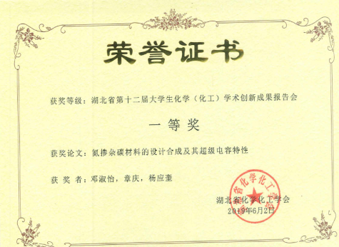 学生获得创新创业、实验设计等国家级奖项共88项,赵驰在第四届全国大学生生命科学创新创业大赛中获得优秀成果奖一等奖,李小华等43名同学在第二届大学生实验技能暨创新创业大赛中荣获国家级特等奖2项、一等奖7项、二等奖11项、三等奖5项、优秀奖7项。姚骏、王亦飞两位同学在第六届全国医药院校药学/中药学专业大学生实验技能竞赛分别荣获二、三等奖。石书娟等同学的成果获第五届“互联网+”大学生创新创业大赛湖北省铜奖。钟柳悦、韦芳等同学在“单县-中国长寿之乡杯-第七届中国大学生高分子材料创新创业大赛”中获得二等奖。查如艳、马泽沔等同学在“第十三届全国大学生化工设计竞赛”中获得二等奖。杨天骄、苏潋等6位同学在“第七届湖北省普通高等学校大学生化学实验技能竞赛”中获得优秀奖4项、非专业组二等奖2项。李薇、雷霄、闫曦月、赵驰等同学的成果《荷叶总碱对酒精诱导小鼠肝损伤的保护作用》在第四届全国大学生生命科学竞赛中获得一等奖,陈娜、张翰卿、吕欣欣、姚婷婷等同学的成果《氮杂环化合物的设计、合成和活性研究》在第十二届“全国大学生药苑论坛”中获得创新成果二等奖。邓淑仪、钟小丽等12位同学在“湖北省第十二届大学生化学(化工)学术创新成果报告会”中获得一等奖1项,二等奖4项,三等奖5项。