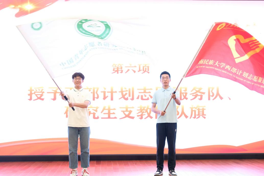 志愿者代表展示西部计划志愿服务队、研究生支教团队旗 杨光煇摄