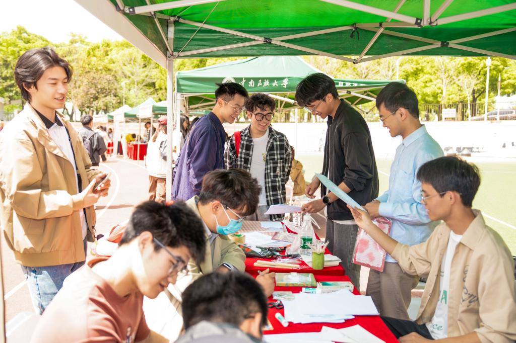 开幕式结束,社团风采展火热进行,展位上人流涌动。南湖棋社摆出“弈路有你”棋艺擂台,棋手们屏息对弈,黑白棋子在棋盘上演绎智慧交锋;民族舞协会举办“服饰识民族”互动游戏,多彩服饰成为文化交流的鲜活载体;玫瑰园诗社将剪纸艺术与诗词创作融合,在红纸剪裁的花鸟虫鱼旁题满即兴诗句,成就“剪纸成诗”的雅趣;计算机协会则开展硬件拆解体验,通过亲手拆卸组装,带领同学们揭开电脑内部构造的神秘面纱。“一次性体验12个社团活动,动手又动脑,我切身感受到了民大社团的魅力!”生物医学工程学院24级陈宗祺手持盖满印章的集章卡兴奋不已。
