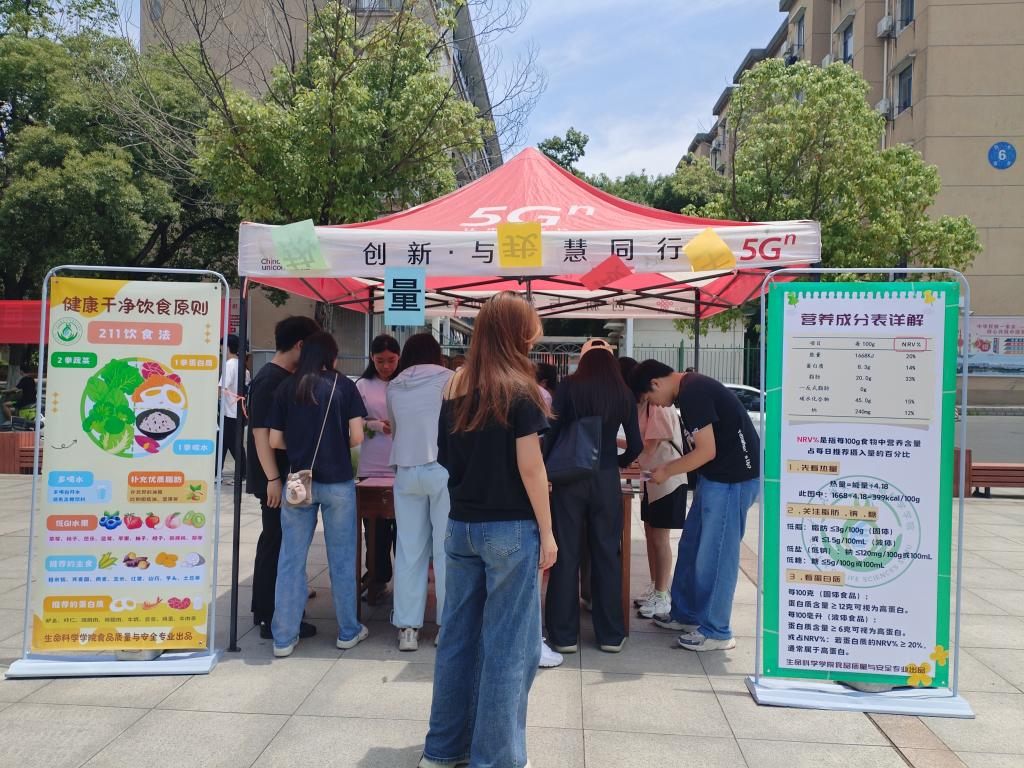 活动当天,生命科学学院精心准备了内容丰富、形式多样的食品安全科普环节。其中,“知食力”一周减脂食谱展示区成为一大亮点,该院食品质量与安全专业的导师团队根据大学生饮食特点,精心设计了健康食谱,并搭配低脂食品试吃体验,让同学们直观感受到科学饮食的魅力。食品科普展板则详细介绍了如何通过查看配料表计算热量、合理搭配膳食结构等实用知识,引导同学们关注日常饮食健康,培养良好的饮食习惯。