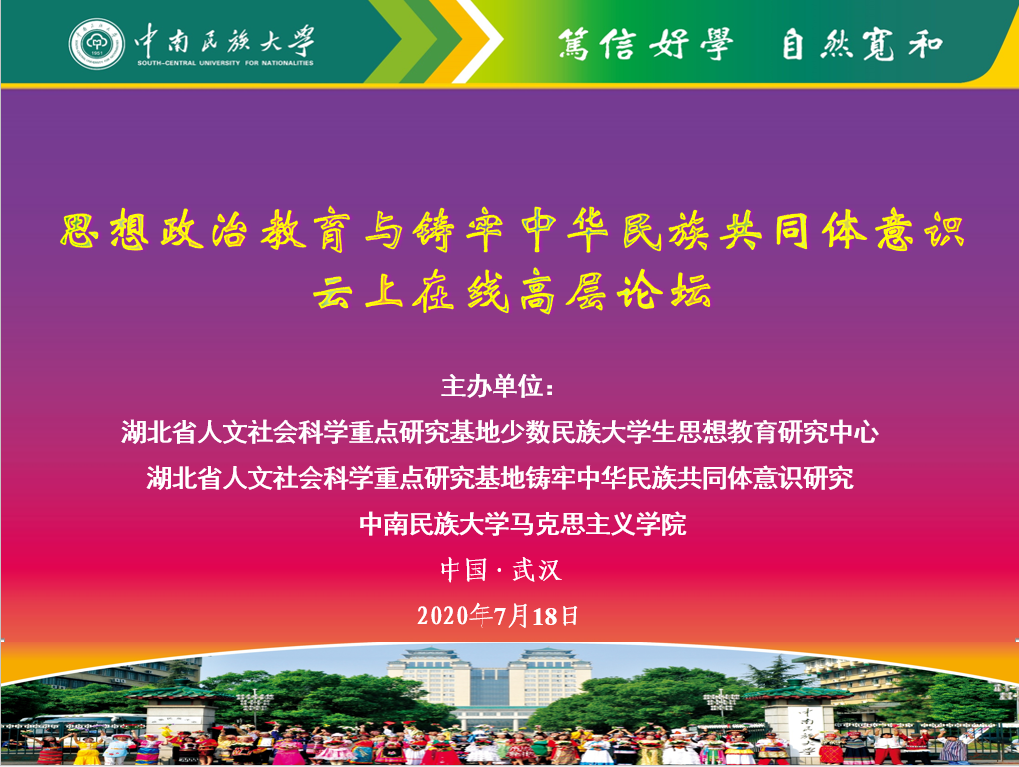● 中心新闻报道 2020年7月18日,湖北省人文社会科学重点研究基地“少数民族大学生思想教育研究中心”、湖北省人文社会科学重点研究基地“铸牢中华民族共同体意识研究”、beat365英国正版唯一网址马克思主义学院联合举办“思想政治教育与铸牢中华民族共同体意识”云上学术会议。来自清华大学、北京大学、武汉大学、北京科技大学、华中师范大学、武汉理工大学的教授吴潜涛、骆郁廷、孙来斌、彭庆红、秦再东、朱喆以及《思想教育研究》《思想理论教育》《江汉论坛》《湖北社会科学》《学校党建与思想教育》等期刊杂志的主编曹宁华、陈金清、唐伟、谢成宇和beat365英国正版唯一网址的专家学者一起“理上网来”,开展了一场建构学术共同体,铸牢中华民族共同体意识的生动实践。