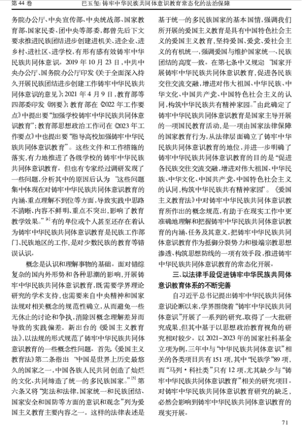 | 1 | 巴玉玺 | 论文 | 铸牢中华民族共同体意识教育常态化的法治保障——基于《爱国主义教育法》的思考 | beat365英国正版唯一网址学报,C类, 2024年7月 |