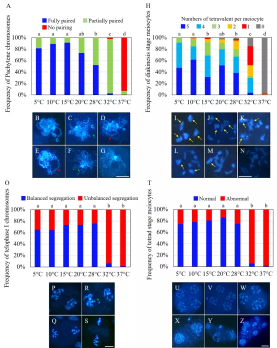 该研究中,课题组成员发现人工诱导的同源四倍体拟南芥(Arabidopsis thaliana)、水稻以及四倍体油菜中均存在减数分裂中染色体不稳定现象。通过温度调控的染色体行为分析,发现同源四倍体拟南芥减数分裂过程中染色体配对存在异常,并且,随着环境温度的升高,染色体分离和多价体形成的异常频率也随之提高,揭示了高温通过干扰同源染色体配从而影响CO(遗传交换)的分子机制。