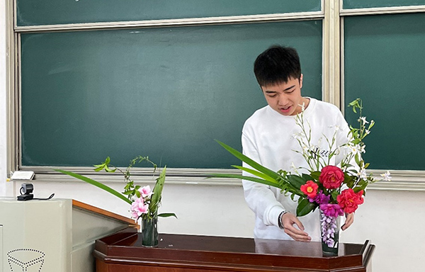 “要选择合适的花材,注重色彩搭配和造型,才能营造出高雅深远的意境!” “作品要创新,弘扬时代主旋律,迸发正能量!”时值清明,莺飞草长,花木飘香,提高学生美学素养和培育美好心灵,实现“五育并举”,生科类2107班在班导师龚汉雨的带领下举行了插花艺术实践活动。学生们3人一组,每组制作了2-3个作品,再进行展示、赏析和讲解。“红花和紫花、粉红色花材搭配,这样就和谐、不突兀。” “按照中华传统美学思想,可以适当利用线形柔枝飘逸的动感,形成深远的意境。”龚老师从理论和实践两方面进行了指导,同学们相互点评帮助,都做出了满意的插花作品。本次实践活动把生物学和艺术美学知识进行了有机融合,促使学生努力做到文、理、艺、美兼修,科技和人文知识融会贯通和互促共进,指导学生陶冶情操,培养懂生活、爱生活、会生活的情趣,促进学生综合素质全面发展。