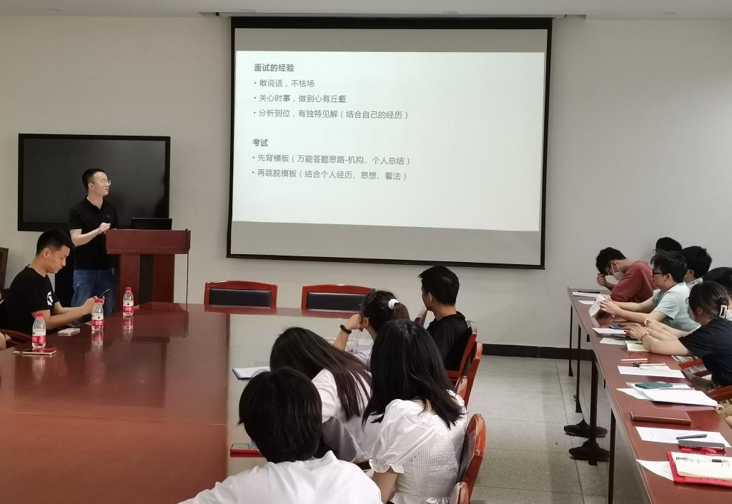 优秀毕业生徐宵粲和高云分享了自己的考博经历、考前准备、面试心态、联系导师等方面的经验;优秀毕业生陈欢和王帅分享了自身的求职经历,并总结了投简历、面试、找工作等各环节技巧;优秀毕业生王政从自己考公务员的经历出发,分享了公务员考试复习、笔试、面试等环节的注意事项和经验。在互动环节中,研究生积极提问,而毕业生代表们也热情地给予了回复与建议。参会研究生纷纷表示受益匪浅,对自己未来的去向也有了更为清晰的了解和认识,明确了自己的努力方向。