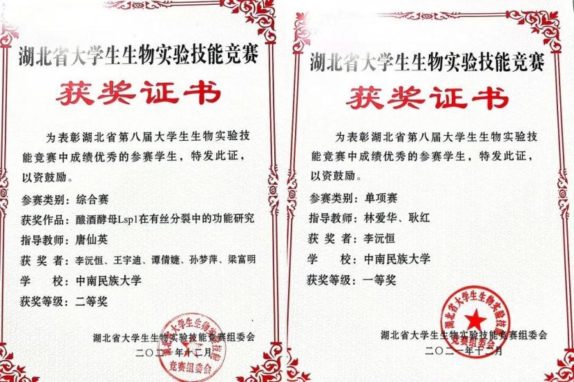 志之所趋,无远弗届。在专业学习之余,李沅恒也积极参加了各种竞赛活动。由于大二下的课业较为繁忙,并没有较多的时间在实验室进行研究,于是李沅恒和其他的团队成员在暑假留校了一个月。他们所做的“Lsp1在酿酒酵母有丝分裂中的功能研究”项目中,李沅恒主要负责感受态细胞的制备、目的片段的转化以及基因组DNA提取等工作。“上学的时候只是利用零星的空余时间做实验,而暑假大多时间都投入实验,这是一种很神奇的体验。”李沅恒回忆道,“当时我的一项任务就是跑蛋白,做聚丙烯酰胺凝胶电泳。当时我的操作还不是很熟练,但是通过一整个七月的研究,我熟练掌握了这项操作。”无巧不成书。由于疫情影响,李沅恒参加的湖北省生物竞赛延期至大三上学期。当他九月份开学参加湖北省生物竞赛时,恰好他的题目就是做聚丙烯酰胺凝胶电泳,他也十分顺利的完成了比赛。一分耕耘,一分收获。李沅恒荣获第五届全国大学生生命科学竞赛省级二等奖、湖北省第八届大学生生物实验技能竞赛一等奖。