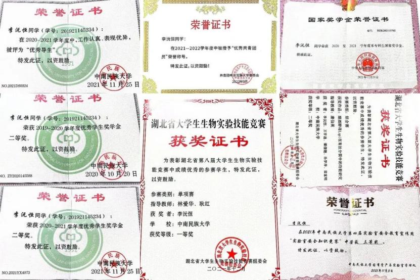 大学四年期间,李沅恒的综合成绩名列前茅,获国家奖学金、优秀学生奖学金一等奖,二等奖等;荣获“三好学生”、“优秀导生”、“优秀共青团员”等荣誉称号;获第五届全国大学生生命科学竞赛省级二等奖、湖北省第八届大学生生物实验技能竞赛一等奖、beat365英国正版唯一网址第四届实验室安全知识竞赛三等奖、全国大学生传染病预防知识竞赛省一等奖、湖北省英语翻译大赛优胜奖等奖项。