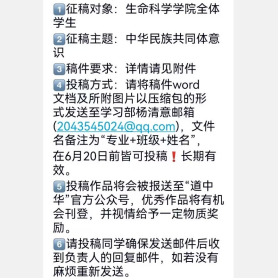为深入学习宣传贯彻党的二十大精神和中央民族工作会议精神,教育引导各民族大学生坚守中华文化立场,聚焦铸牢中华民族共同体意识主线,同时为选拔优秀学生代表参加学校举办的首届“道中华”杯演讲比赛,生命科学学院全院高度重视此次活动,在本科生和研究生中宣传动员学生积极参与,认真准备。
