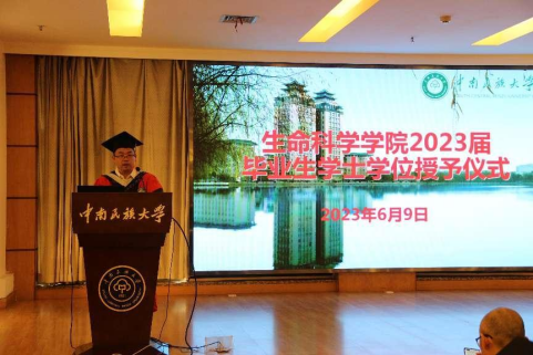 6月10日下午,生命科学学院2023届本科毕业生毕业典礼暨学位授予仪式在润良报告厅举行。副校长杜冬云、院党委书记谢岚、院长余光辉、院党委副书记邵国良、副院长谭艳平、毕业班辅导员方文杰和李泳璋老师、毕业班班导师、院党政办公室主任江华芳老师和学工办主任李茜老师出席仪式。