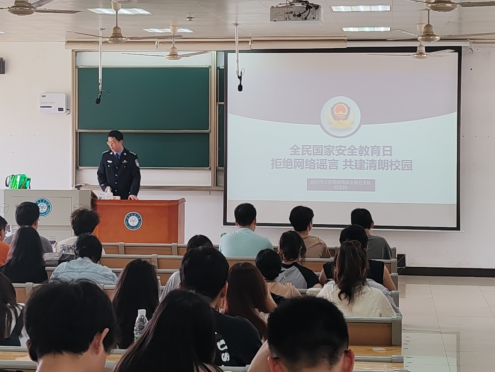 “国家安全是民族复兴的根基。”2024年4月15日是第九个全民国家安全教育日,为了加强同学们的国家安全意识,承担维护国家安全的责任和义务,生命科学学院邀请了武汉市公安局网络安全保卫支队任忠良警官及其随行的两名队友对2023级全体本科生同学进行以“拒绝网络谣言,共建清朗校园”为主题的国家安全教育宣讲,此次宣讲由23级辅导员李茜老师主持。