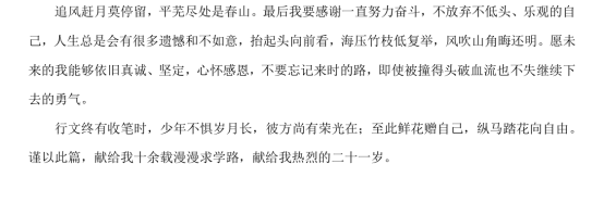 行文终有收笔时,少年不惧岁月长,彼方尚有荣光在;至此鲜花赠自己,纵马踏花向自由。谨以此篇,献给我十余载漫漫求学路,献给我热烈的二十一岁。