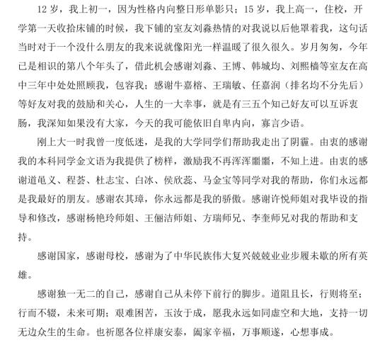 我要感谢一直努力奋斗,不放弃不低头、乐观的自己,人生总是会有很多遗憾和不如意,抬起头向前看,海压竹枝低复举,风吹山角晦还明。愿未来的我能够依旧真诚、坚定,心怀感恩,不要忘记来时的路,即使被撞得头破血流也不失继续下去的勇气。