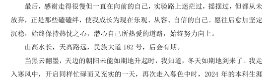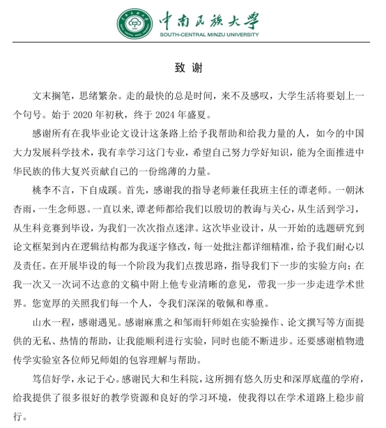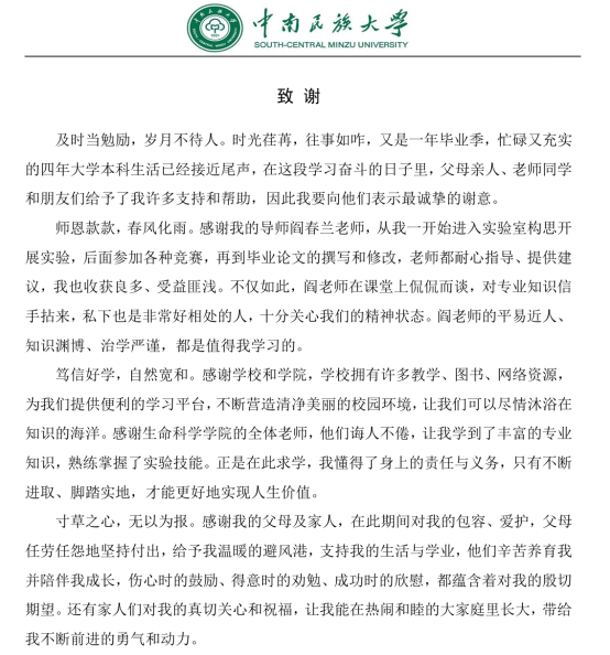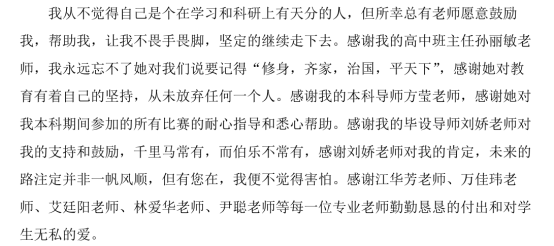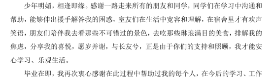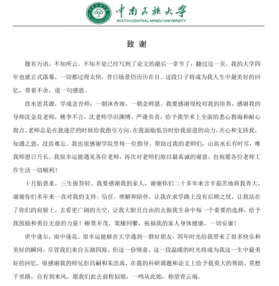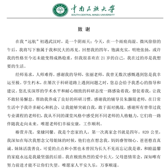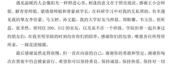 毕业在即,我再次衷心感谢在此过程中帮助过我的每个人,在今后的学习、工作和生活中,我会不忘亲人的嘱托,牢记师长的教诲,勇敢面对遇到的挫折和困难,继续努力追求,不断前行!最后祝愿大家都万事顺遂、喜乐安宁!
