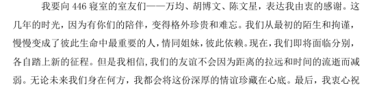 经过两三个月的全力以赴,我的论文终于尘埃落定,这也意味着我即将告别这四年充实而难忘的大学生活,为它画上圆满的句号。回首这四年,从入学第一年的不知所措,到现在的成熟稳重。四年的时光悄然无息地溜走,这四年过得太快,我,在不知不觉中蜕变成了成熟稳重的自己,我们即将分别,但这四年将是我终身难忘的回忆。