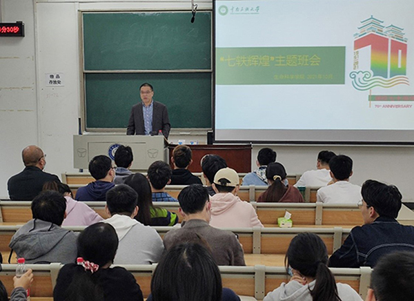 在学校70周年校庆来临之际,校党委副书记、副校长宋发军于10月27日下午在11号教学楼210教室与生科学院学生座谈交流,与同学们畅谈校史校情,以及生科院院史,并了解同学们的学习、生活情况。学院党委副书记杨征,班导师李晓华老师、程国军老师,以及生物制药专业2019级全体学生与会。