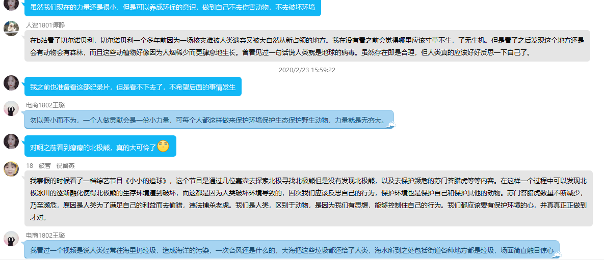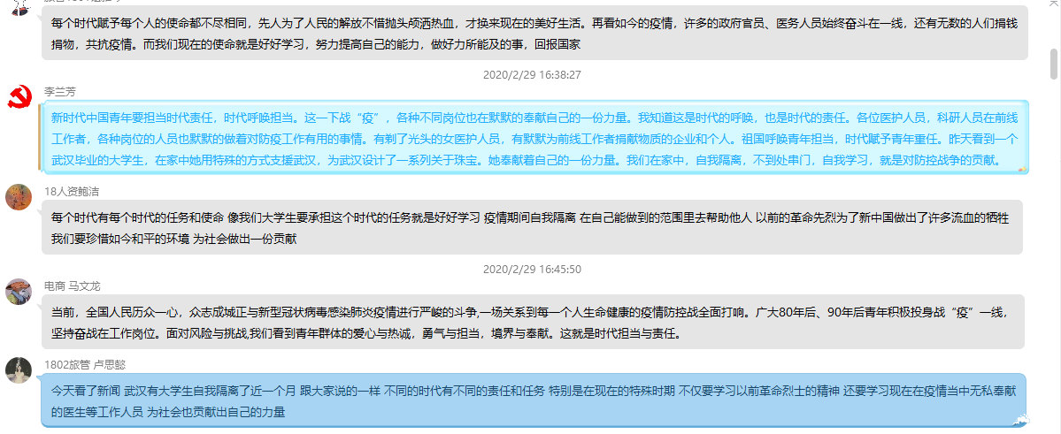 在第二期分享中,同学们向我们分享了《红岩》这部经典红色文学小说,小说讲述无数革命奋斗者们,为了中国革命的胜利抛头颅洒热血的崇高事迹,同学们在阅读这本小说的过程中,心中充满了对革命先辈们的崇高敬意,深深地被他们勇敢无畏的精神打动。沙桂冰同学向我们分享了她的感受,是革命先辈用艰苦奋斗换来了我们如今的幸福生活,在这次疫情中医护人员义无反顾投身防疫一线,为人民的健康保驾护航,不同时代造就不同的英雄,这种崇高的精神值得我们去歌颂。姚亚南老师总结前有革命前辈不怕牺牲,现有白衣天使无惧生死,他们都担负起了应有的责任,分享的最后,同学们就姚亚南老师给出的讨论话题“时代担当与责任”纷纷发表自己的看法。