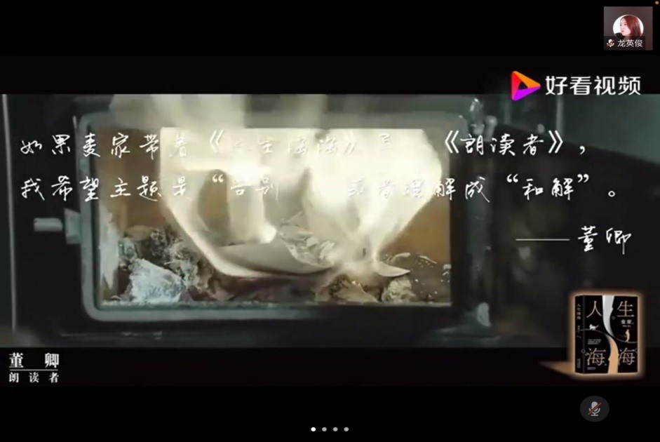 第二位分享的是龙英俊同学,她主要从《人生海海》书中人物“上校”的经历和性格特点入手,发表了她的观点和看法:“上校差不多活了一个世纪,人人海海,他的一生经历了很多事,见过很多人,当过木匠,当过军官,当过医生,养过蚕,每一件事情都做得非常出色,他就是一个活着了不起的人。”并且得出了“没有完美的人生,不完美才是人生”的感悟。