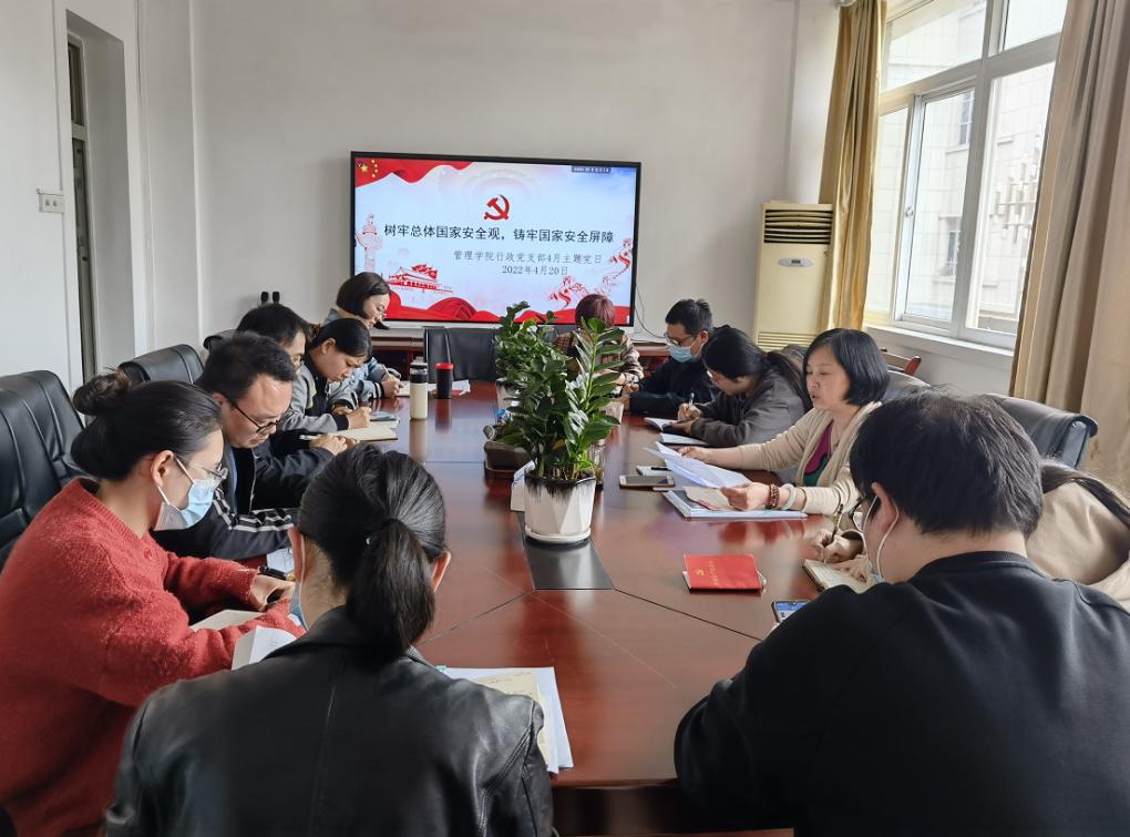 2022年4月20日下午,管理学院行政党支部在5号楼222会议室召开以“树牢总体国家安全观,筑牢国家安全屏障”为主要内容的主题党日活动。活动由支部书记邹反修主持。
