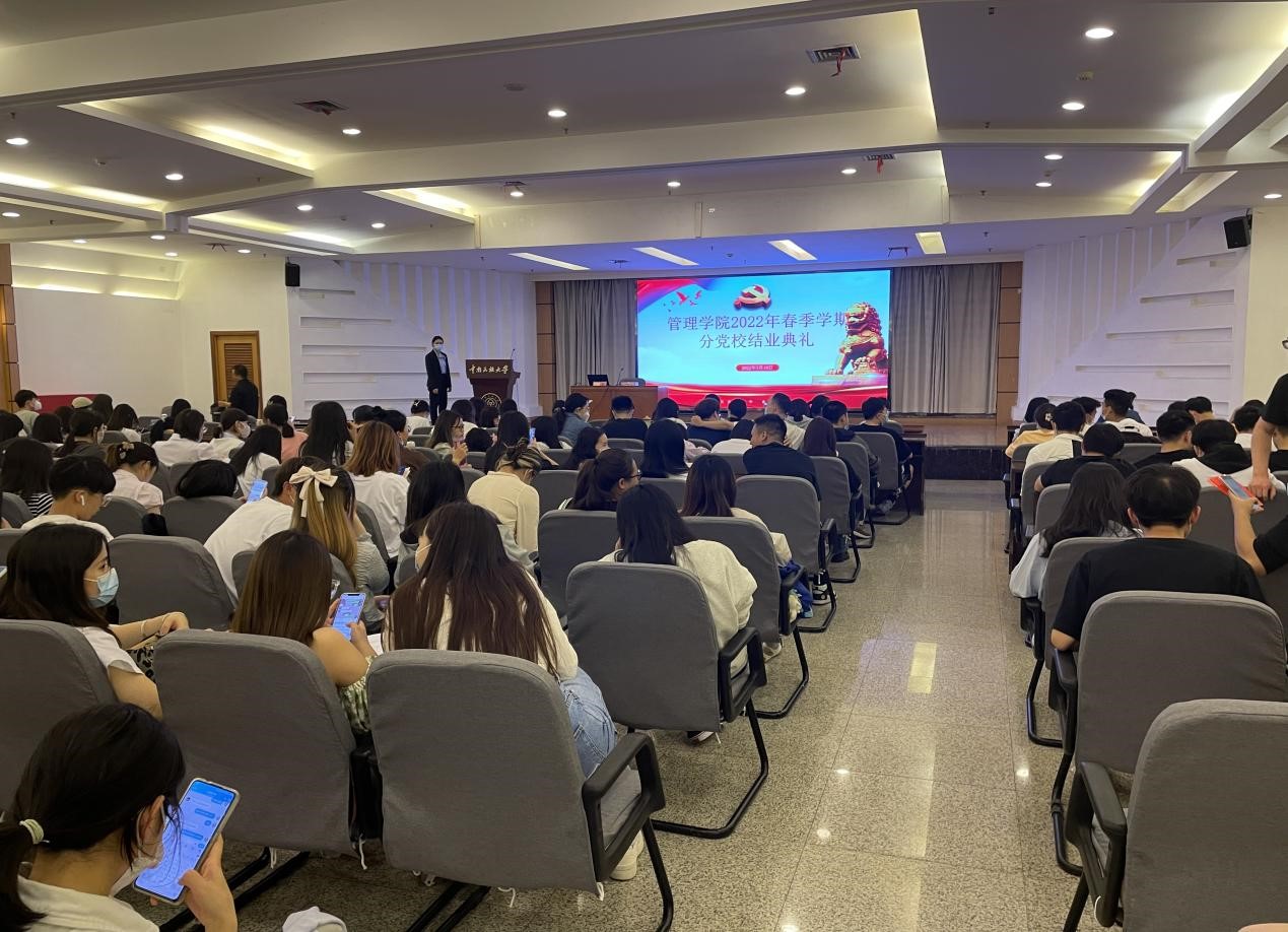 2022年5月18日晚,管理学院在润良报告厅举行2022年春季学期分党校结业典礼,管理学院党委书记邹反修、党委副书记雷长生、分党校班主任罗兰、学院春季学期分党校学员代表参加,会议由雷长生主持。