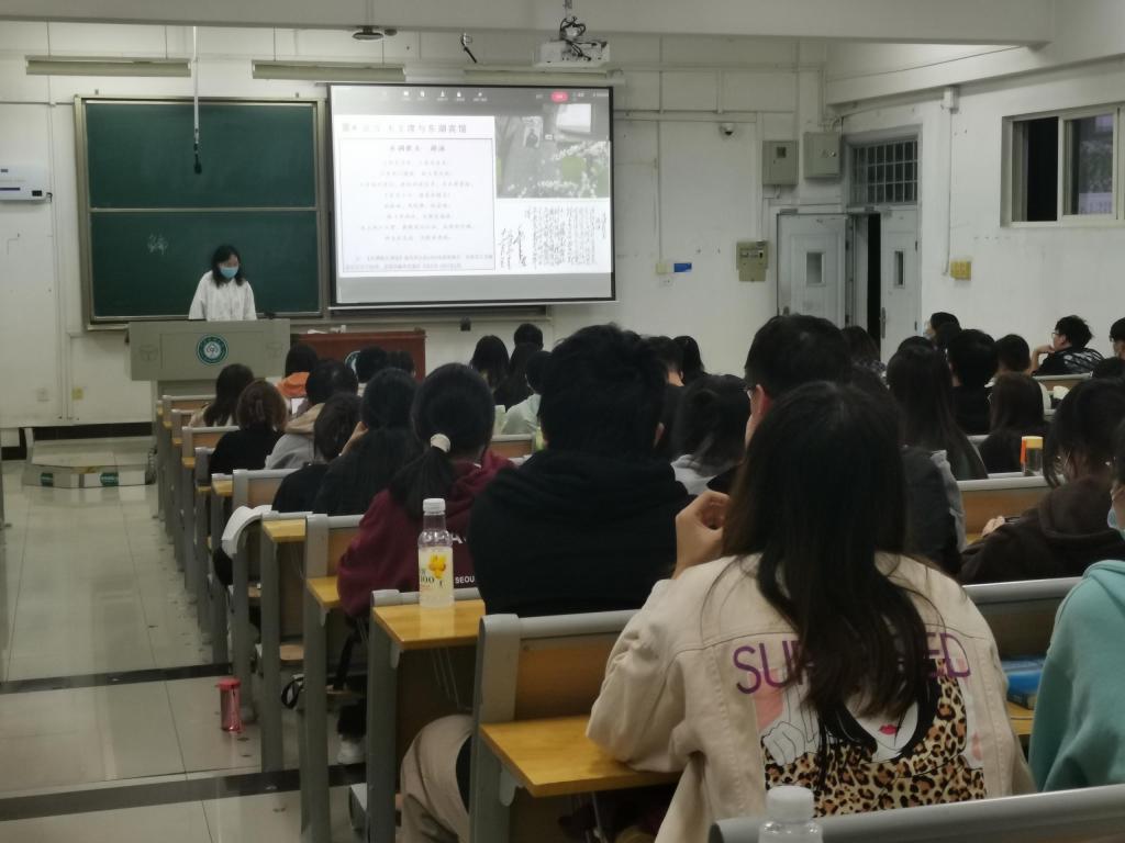 李东娟老师以东湖宾馆为例讲酒店的红色故事,《水调歌头.游泳》是毛主席在东湖宾馆住宿期间写的,课堂上安排学生集体诵读毛泽东诗词。