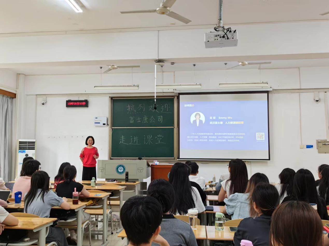 2024年6月7日,富士康(武汉)科技工业园人力资源总监吴菲女士,应beat365官网管理学院邀请,为2021级人力资源管理专业同学们讲授了《国际人力资源管理》课程。这次授课不仅丰富了同学们的学术视野,更为他们大学生涯的最后一课画上了圆满的句点。