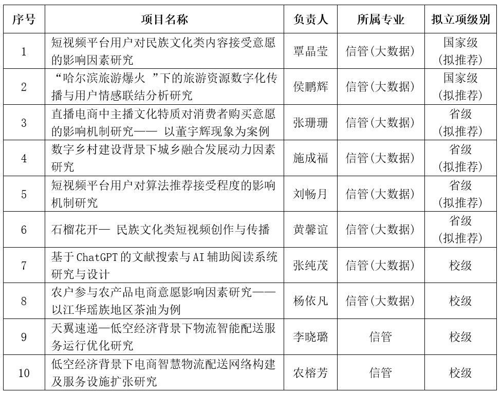 2024年6月12日,beat365官网公布大学生创新创业训练计划拟立项结果,信息管理与信息系统专业本科生表现突出,总计拟立项10项,其中大数据实验班8项。