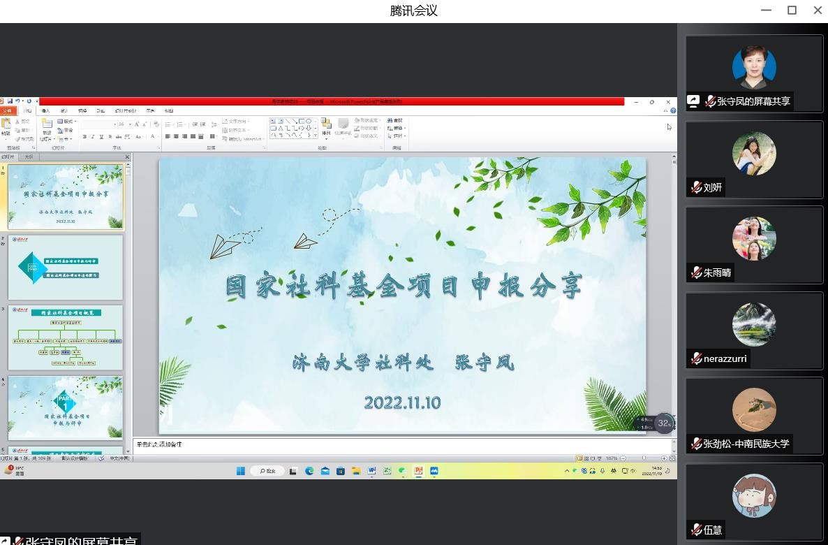 为使我院师生对国家社科基金申报流程及社科基金项目申请书撰写有更进一步的了解,提高社科基金的申报成功率,我院特别邀请济南大学社科处处长、商学院管理学与工程学科教授,东北师范大学教育经济管理学科博士生导师张守凤教授,于11月10日15:00以线上交流的形式开展了主题为《国家社科基金申报体会分享》的学术讲座。此次讲座由beat365英国正版唯一网址科学研究发展院、beat365英国正版唯一网址管理学院、beat365英国正版唯一网址民族地区数字化发展与治理研究中心、beat365英国正版唯一网址高校风险预警防控研究中心和教育部民族院校会计学专业虚拟教研室联合举办。管理学院教师以及研究生共100余人参加了本次讲座。讲座由张劲松院长主持。