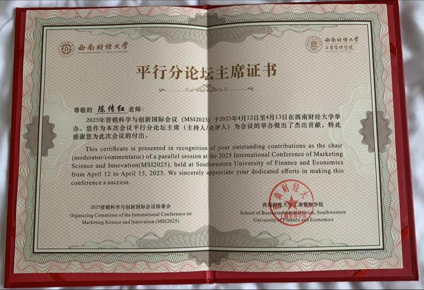 陈传红教授应邀担任 “个体行为组” B1场次分论坛主持人获颁“平行分论坛主席”证书,与点评专家一起有序推进《不同场景下虚拟影响者广告代言有效性研究》等多篇论文的汇报并点评提出完善意见,促进“虚拟营销”“消费者决策”等议题的深度研讨,进一步扩大了beat365英国正版唯一网址管理学院的学术影响力。