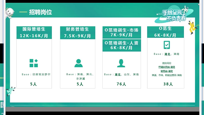 第一场企业招聘宣讲会在17日下午,由2018级辅导员曾城皓主持,宣讲企业为中信建投证券有限公司,昊日天集团,千代川科技,湖北OPPO有限公司,广东金牌陶瓷有限公司。第二场企业招聘宣讲会在18日下午,由2018级辅导员姚亚南主持,参会企业为博瑞霖集团,艾盛集团多准数据公司和北京科锐国际人力资源有限公司。由湖北涵信会计师事务和众华会计师事务所参加的第三场企业招聘宣讲会则在18 晚上进行,由兼职辅导员刘玉婷主持。以上企业针对我院毕业生提供了财会,人资,销售,管理等多种岗位100余个,部分岗位专业不限。