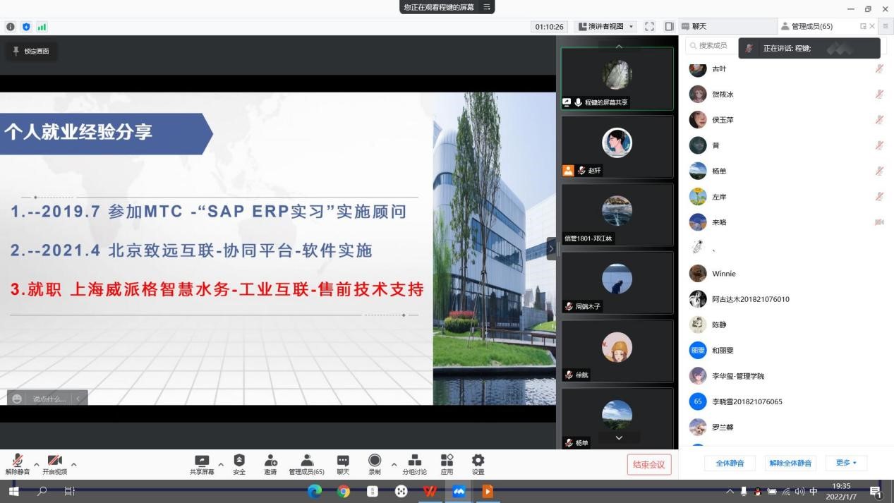 随着2022年研究生入学考试落下帷幕,越来越多的毕业生投入到找工作、找实习的队伍中。为了帮助考研学生更快更全面的了解求职流程和求职技巧,2022年1月4日至8日,管理学院2018级B部各专业在辅导员姚亚南老师的组织下,邀请已经毕业的校友和已签约的同学担任主讲嘉宾陆续开展了线上求职经验交流会,各班的班导师也纷纷参加了交流会。